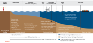 The United Nations Convention on the Law of the Sea (UNCLOS) entered into force in 1994 and regulates all uses of the seas and provides the legal framework for international ocean governance. The UNCLOS which is a legally binding UN treaty covers the ocean zones that lie beyond national waters (namely “high seas”) and the international seabed area. UNCLOS contains a special section on the high seas but it prescribes only general protective measures. There are some international conventions that address individual activities on the high seas and maritime navigation is regulated by the International Maritime Organization whereas high seas fisheries are regulated by the Food and Agriculture Organization (FAO) of the United Nations , United Nations Fish Stock Agreement and International Seabed Authority . In addition to these sectoral agreements, there are regional multilateral agreements whose scope extends to individual high seas areas. Currently about 8% of national waters are protected, but only 1% of the high seas.